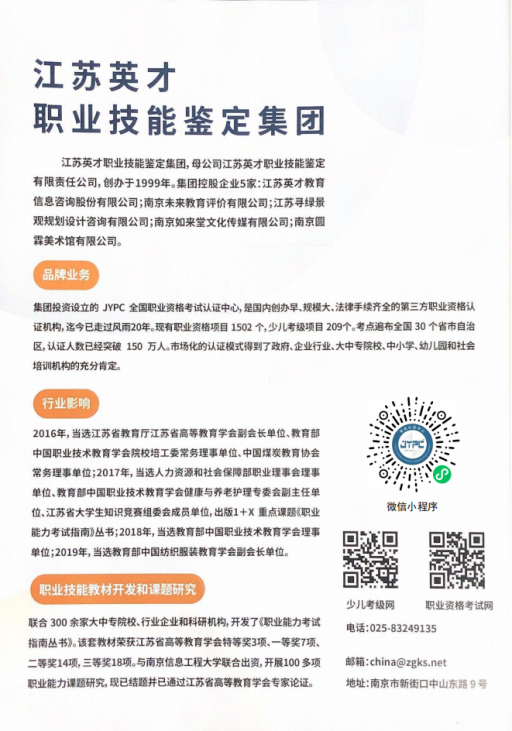 《年鉴》认为:江苏英才职业技能鉴定集团投资设立的 JYPC 全国职业资格考试认证中心,是国内创办早、规模大、法律手续齐全的第三方职业资格认证机构,迄今已走过风雨20年。现有职业资格项目1502个,少儿考级项目209个。考点遍布全国30个省市自治区,认证人数已经突破150 万人。市场化的认证模式得到了政府、企业行业、大中专院校、中小学、幼儿园和社会培训机构的充分肯定。